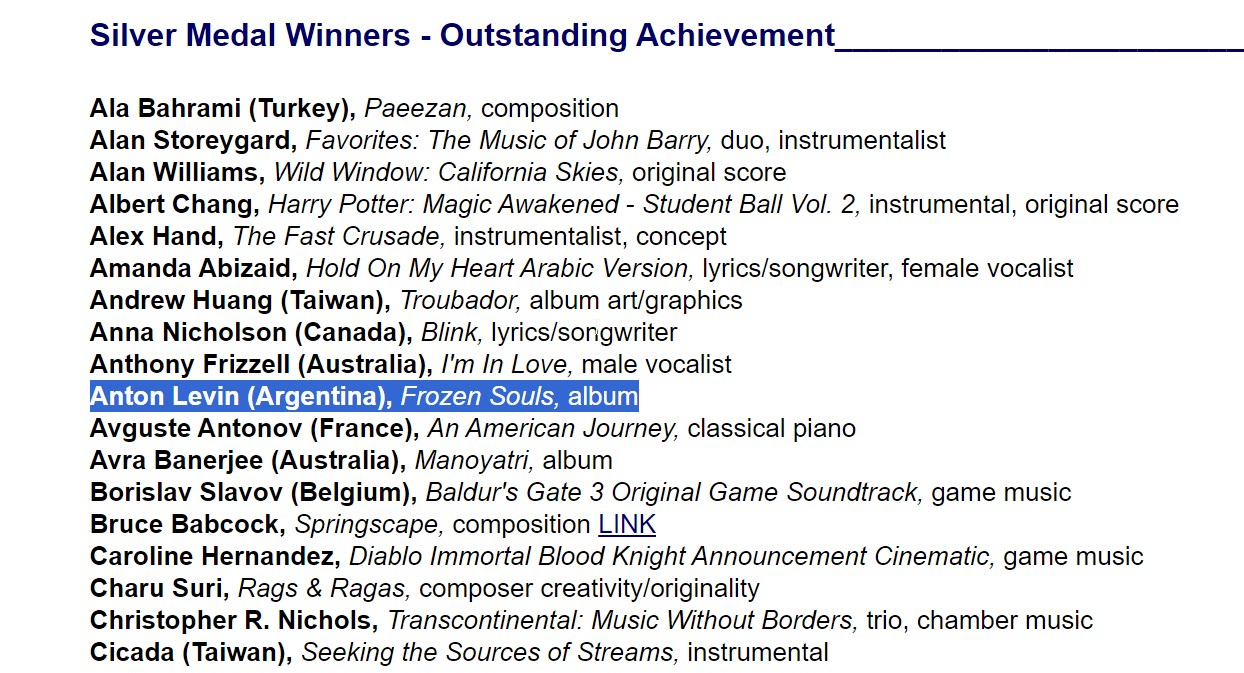 My piano and orchestra album "Frozen Souls" took silver at the Global Music Awards in the "Albums" category. Thank you very much to the organizers for the opportunity and participation.