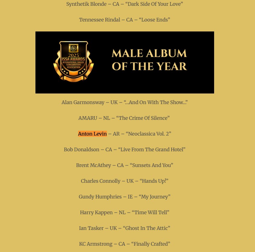 Anton Levin received the prestigious International Singer-Songwriters Association Awards-2025