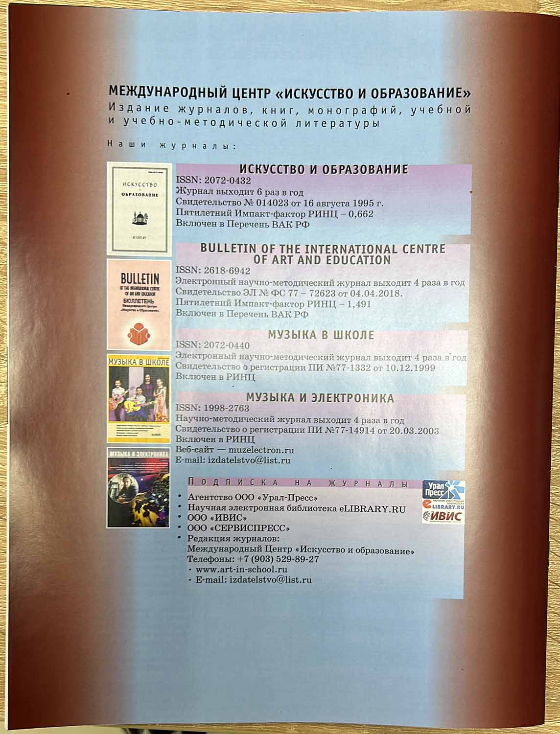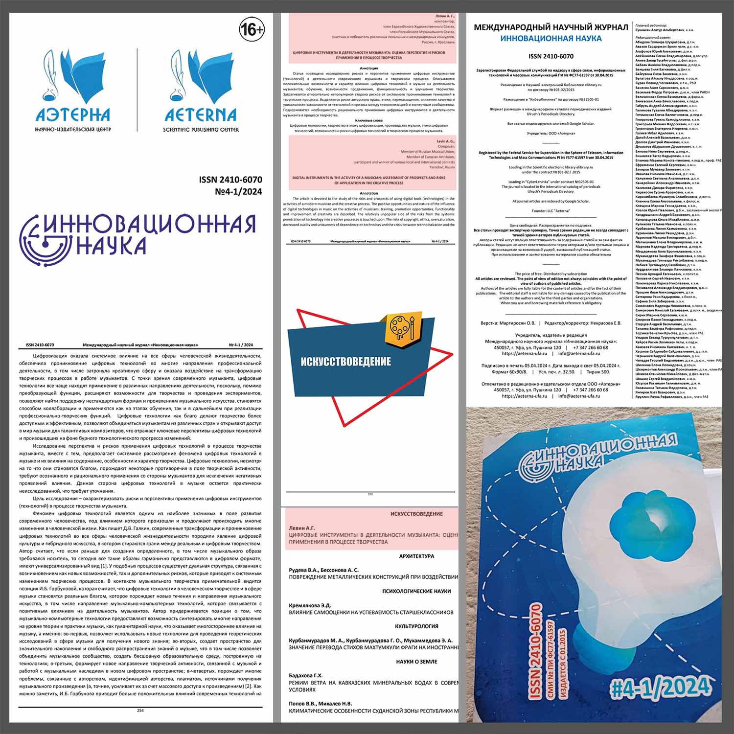 My article "DIGITAL INSTRUMENTS IN THE ACTIVITY OF A MUSICIAN: ASSESSMENT OF PROSPECTS AND RISKS OF APPLICATION IN THE CREATIVE PROCESS" was published in the International scientific journal INNOVATIVE SCIENCE issue april 2023. In this article I tried to do a little research in the field of using new technologies, musical instruments, specialized programs in writing music, even in a "remote format".