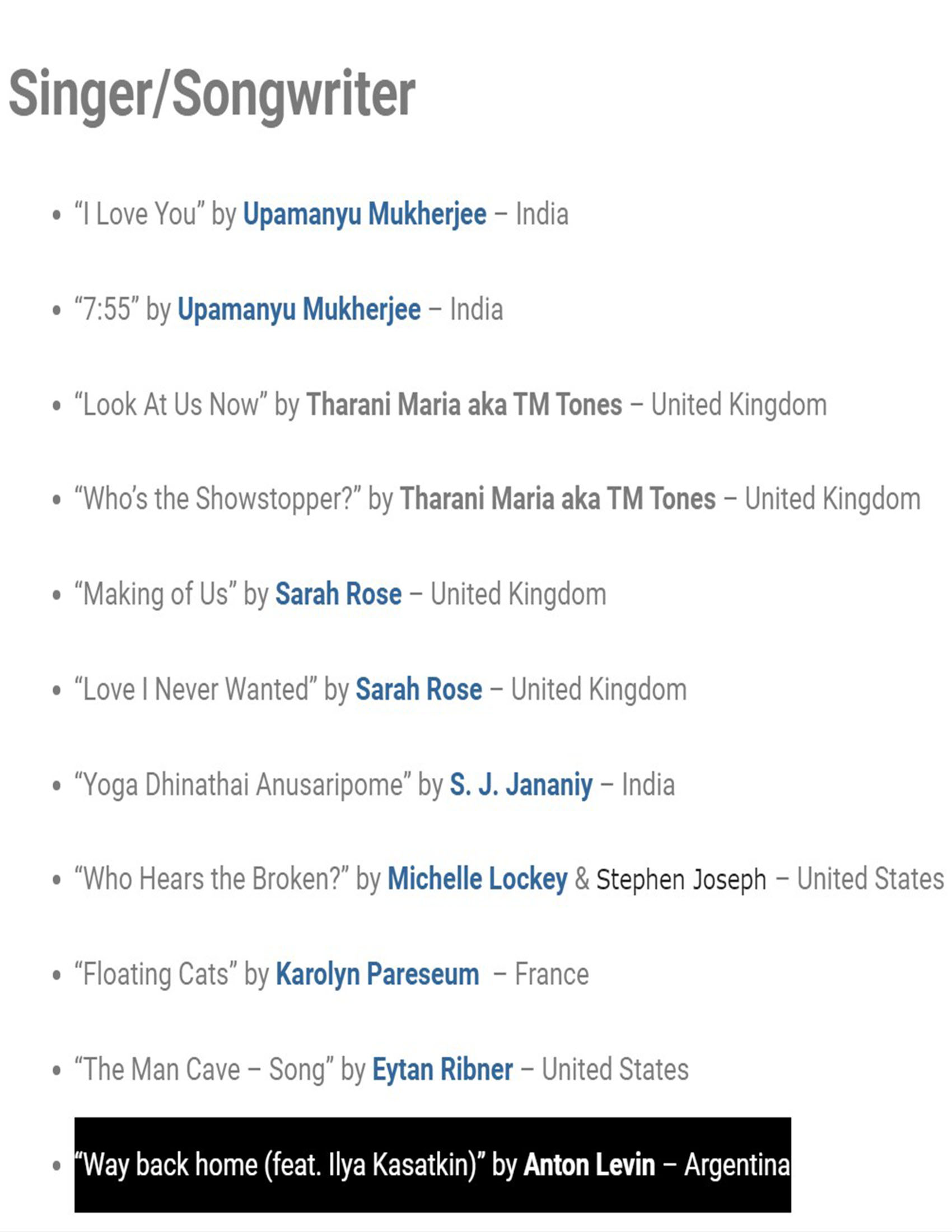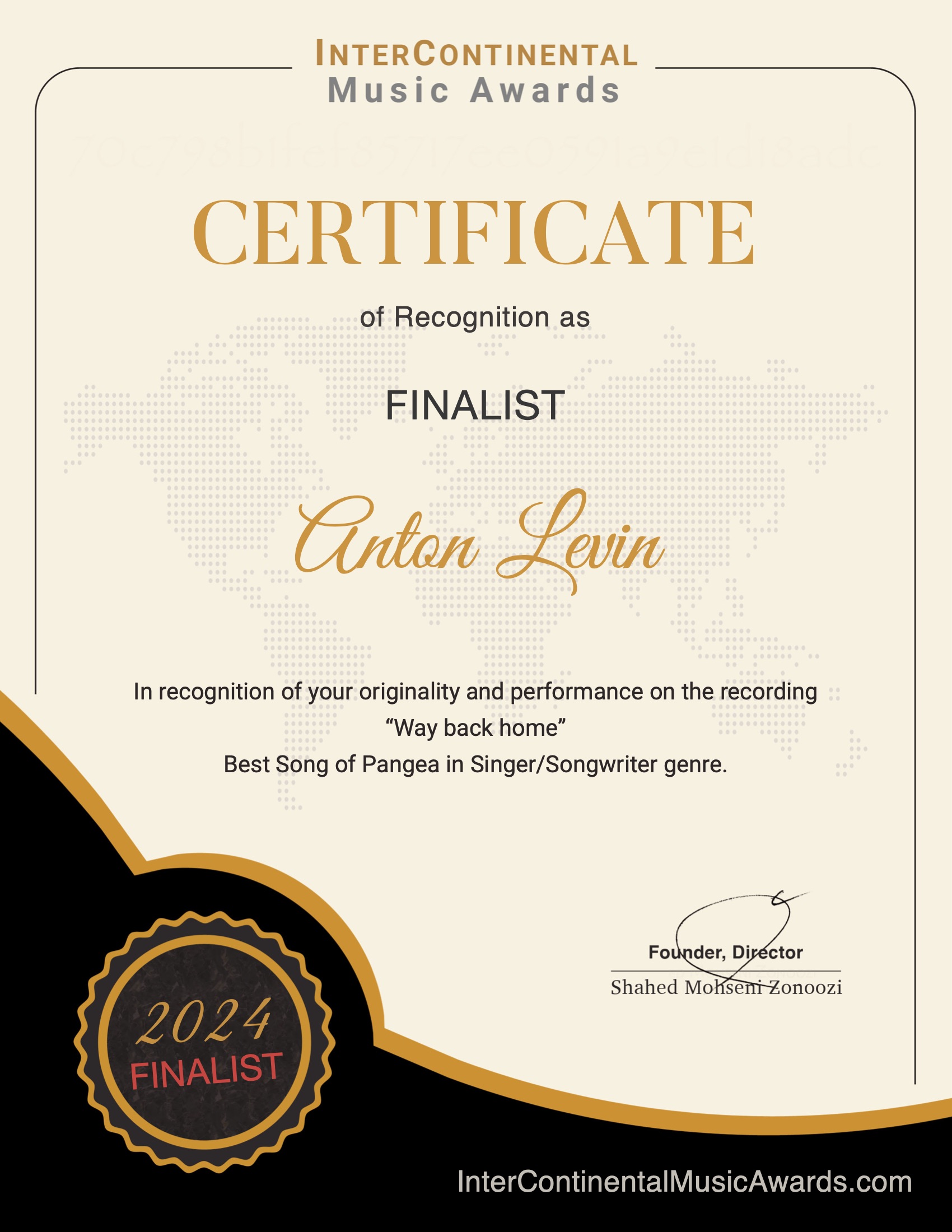 This year I became a finalist in one of the world's largest competitions in the category "Singer/Songwriter". The song "Way back home" was recorded with my vocalist Ilya Kasatkin and took an honorable place among a huge number of competitors from different countries. The 2024 InterContinental Music Awards showcased outstanding global talent across a spectrum of genres and artists..